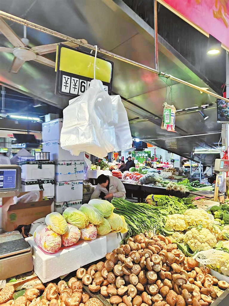 在郑州市德济路陇海四季鲜市场内,菜贩的固定摊位上方挂着成沓的不可降解塑料袋。在郑州市管城后街的街边,流动摊贩的车子上挂着不可降解塑料袋。郑州市花园路与农业路交叉...