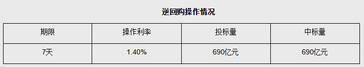 【大河财立方消息】 7月8日,中国央行开展690亿元7天期逆回购操作,投标量690亿元,中标量690亿元,操作利率为1.40%,今日有1310亿元逆回购到期,当日实现净回笼620亿元人民币。