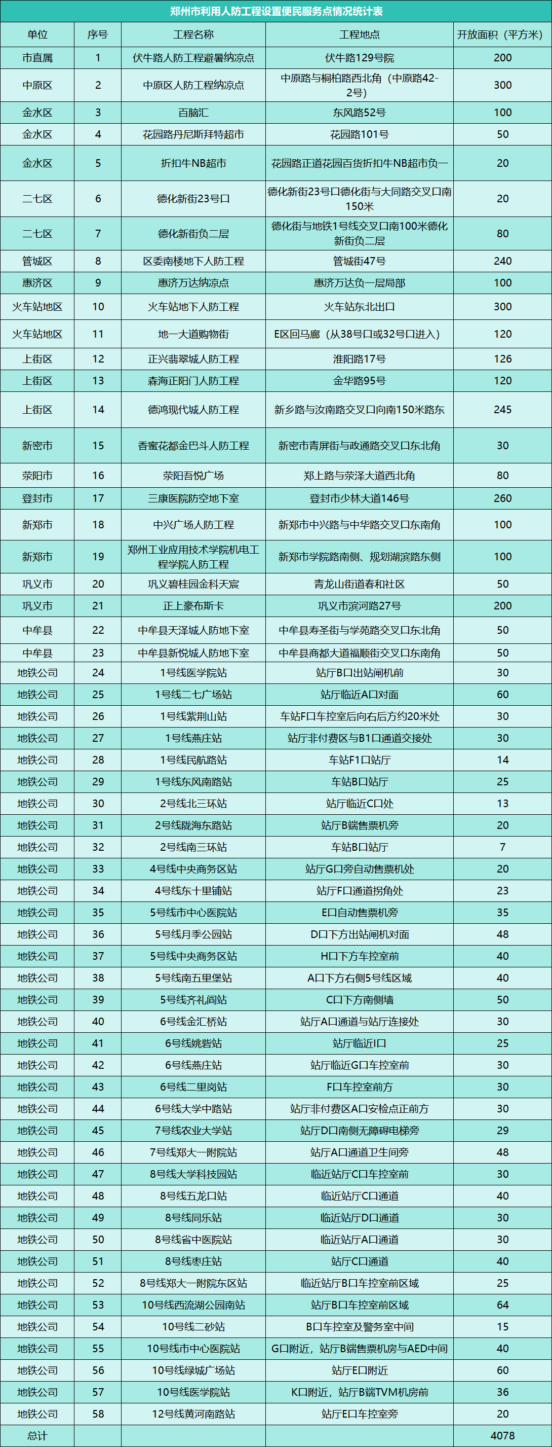 附:郑州市利用人防工程设置便民服务点情况统计表