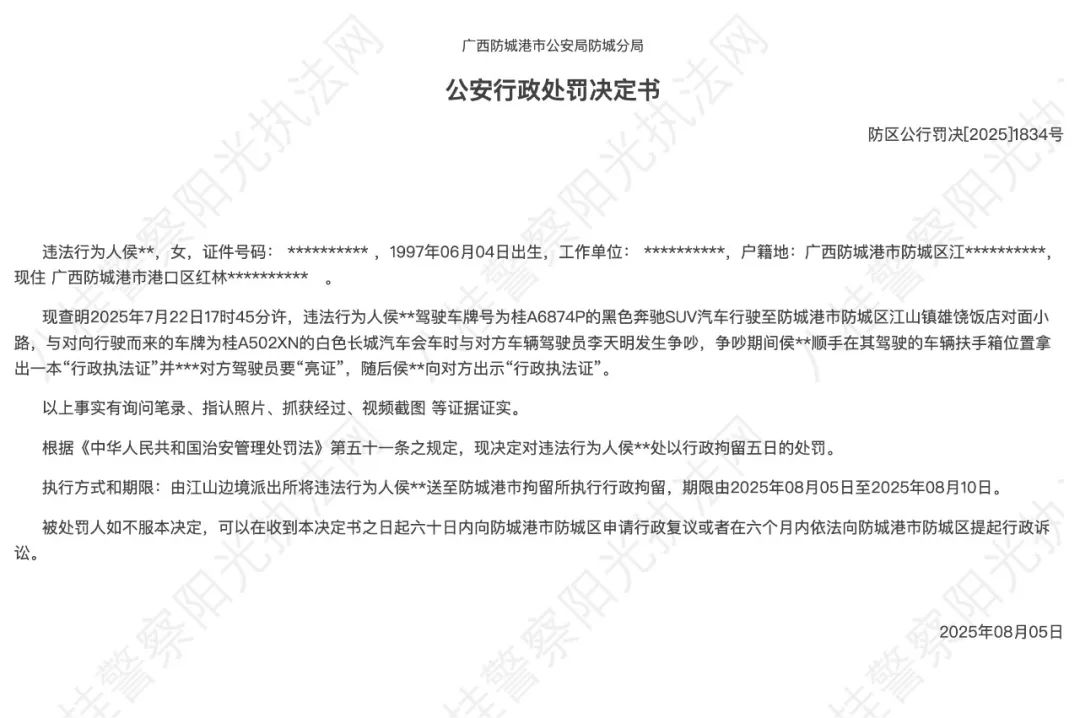 据广西警方,“亮证逼迫让路”事件司机侯某某因违反《中华人民共和国治安管理处罚法》被处以行政拘留五日的处罚。