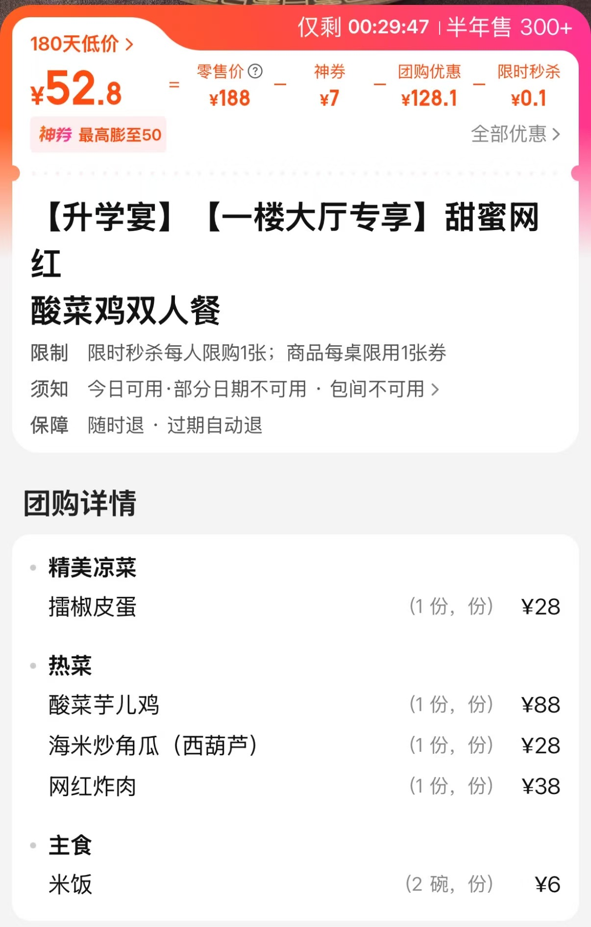美团上,皇宫大酒店双人餐团购价格为52.8元,其中包含凉菜1份、热菜3份、主食1份,零售价为188元,套餐价低至2.9折;此外,还有佛跳墙4人套餐,套餐售价261元,门店原价则为708元。