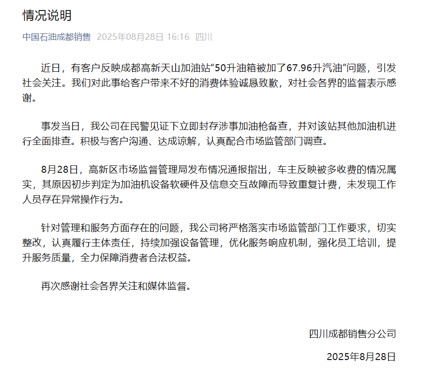 【大河财立方消息】 8月28日,中国石油四川成都销售分公司发布情况说明称,近日,有客户反映成都高新天山加油站“50升油箱被加了67.96升汽油”问题,引发社会关注。对此事给客户带来不好的消费体验诚恳致歉,对社会各界的监督表示感谢。