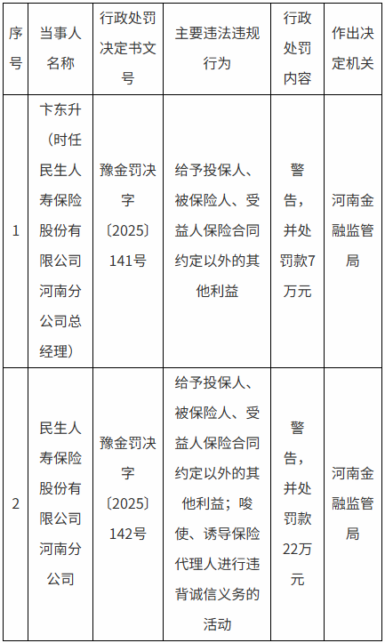 【大河财立方消息】9月9日,国家金融监督管理总局河南监管局披露行政处罚信息,因存在多项违法违规行为,民生人寿保险股份有限公司河南分公司被警告并处罚款22万元。