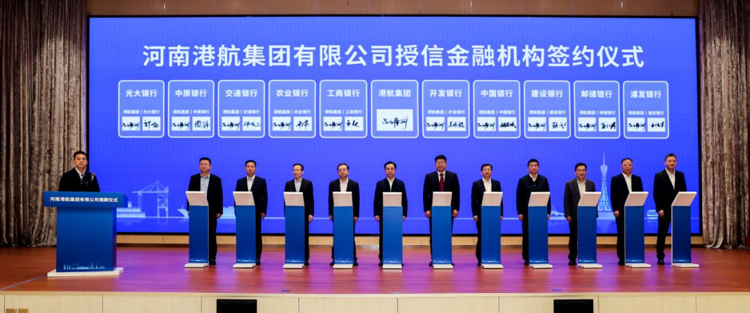 在揭牌仪式现场,河南港航集团与国开行、工商银行、中国银行、 农业银行、建设银行、交通银行、邮储银行、浦发银行、中原银行、光大银行等10家金融机构共同签订战略合作框架协议,授信意向额度共计1403亿元,全力支持港航项目的建设发展。