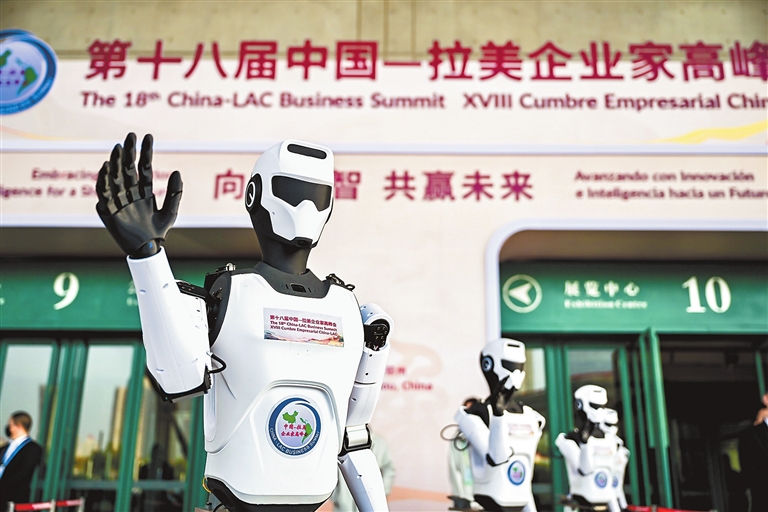 中豫具身智能实验室机器人亮相第十八届中国—拉美企业家高峰会开幕式现场。 本报资料图片 记者 王铮 摄