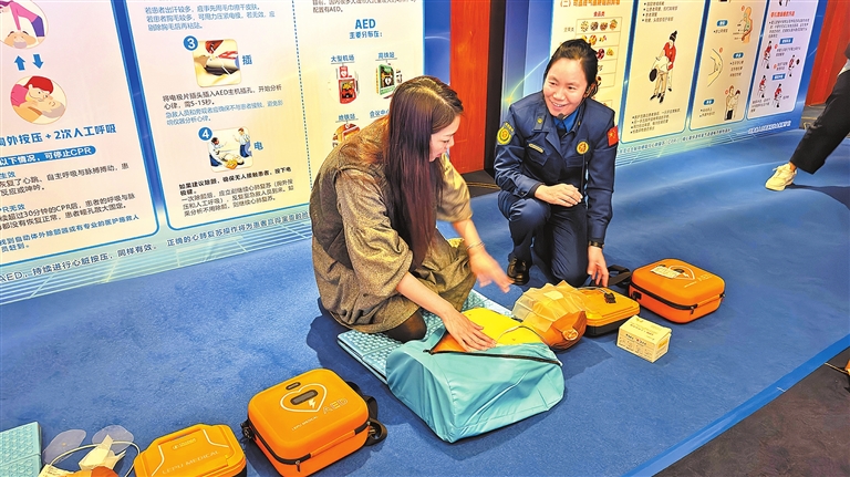 11月10日,河南省2025年工伤保险政策宣传月在郑州启动。图为救护专家讲解心肺复苏急救技能。河南日报记者 王向前 摄