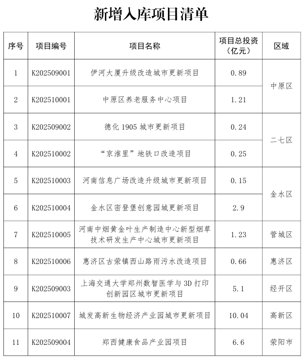 其中,中原区伊河大厦升级改造城市更新项目等15个项目于近期通过评审并完成社会公示,纳入城市更新项目库,15个项目总投资合计47.59亿元。