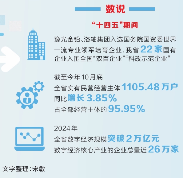 见微知著。现代企业制度是构建现代化产业体系的重要支撑和制度保障,是国企做强做优、民企发展壮大的“定心丸”,更是实现经济提质增效的核心支撑。回望“十四五”,河南坚定践行“两个毫不动摇”,促进各种所有制经济优势互补、共同发展,充分激发各类企业内生动力和创新活力。截至去年底,全省国资国企资产总额7.3万亿元,核心功能和核心竞争力不断增强。用制度创新打通发展堵点,目前全省实有民营经济主体超过1100万户,民营企业活力持续迸发,民营经济蓬勃生长。持续发力中国特色现代企业制度建设,河南工业经济“稳”的基础牢固、“进”的势头强劲、“韧”的特性突出,压舱石作用进一步凸显。