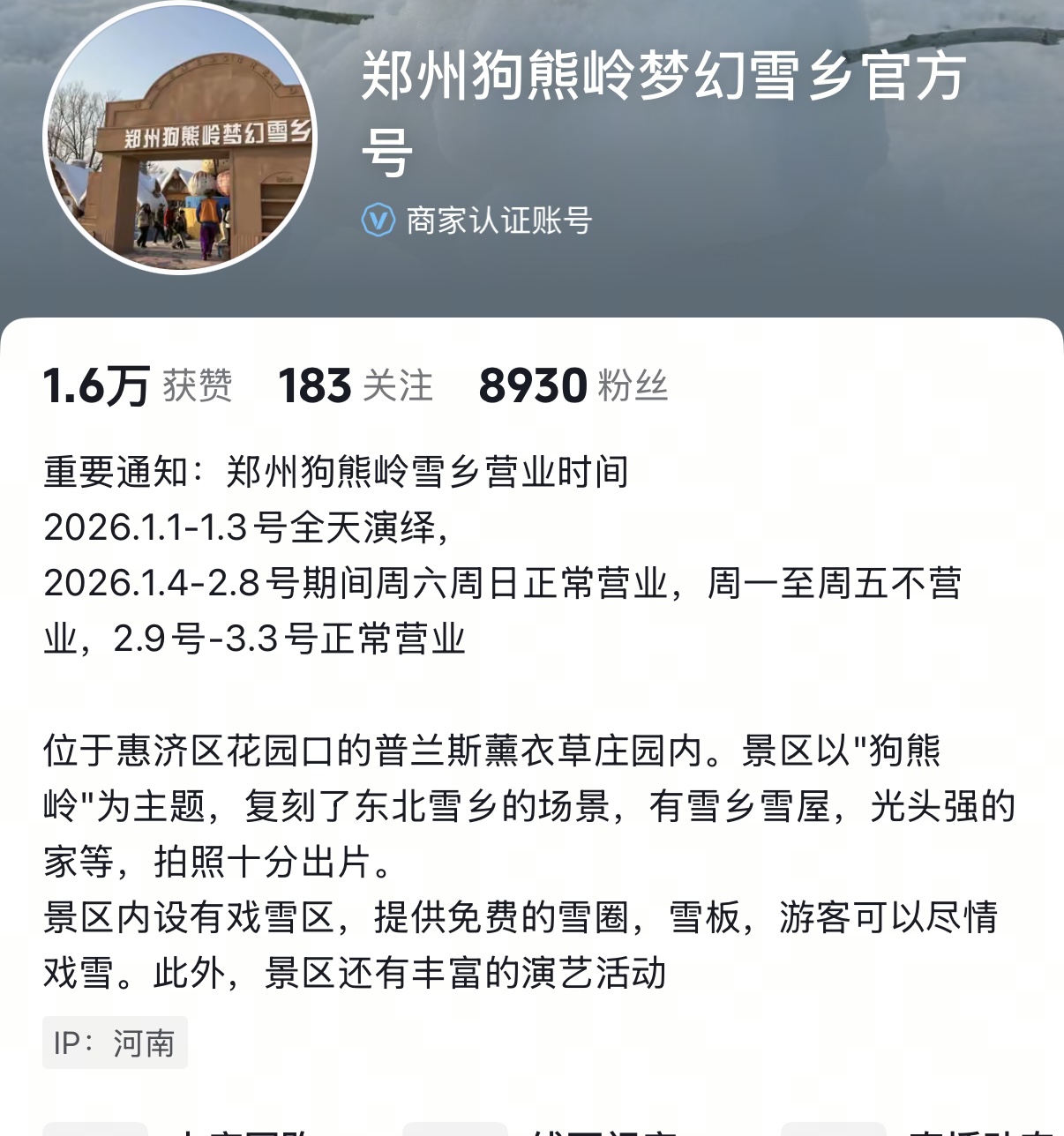 1月6日,记者进一步发现,@郑州狗熊岭梦幻雪乡 的账号简介已更新,其中明确补充了营业时间安排:“1月4日至2月8日期间,每周六、日照常开放……”