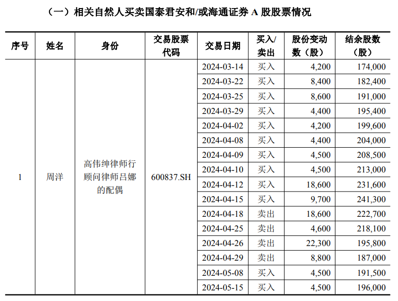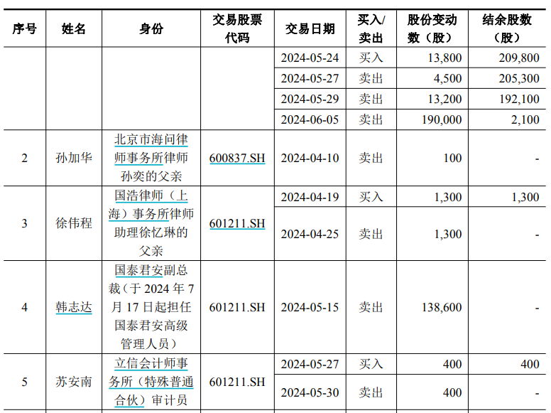 公告显示,今年5月15日,国泰君安副总裁韩志达卖出138600股国泰君安A股股票。韩志达自2024年7月17日起担任国泰君安副总裁,其出具的自查报告承诺持有国泰君安的股票来源为限制性股票激励计划,交易国泰君安股票行为发生在他担任国泰君安副总裁之前。根据韩志达出具的自查报告,其还持有71400股限售股。