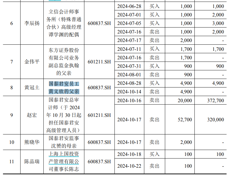 今年10月16日,赵宏卖出20000股国泰君安A股股票,10月17日卖出52700股。赵宏出具的自查报告称,其持有国泰君安的股票来源为限制性股票激励计划;他于2024年10月30日起担任国泰君安总审计师,交易国泰君安股票行为发生在本人担任国泰君安总审计师之前。根据自查报告,赵宏还持有202300股限售股。
