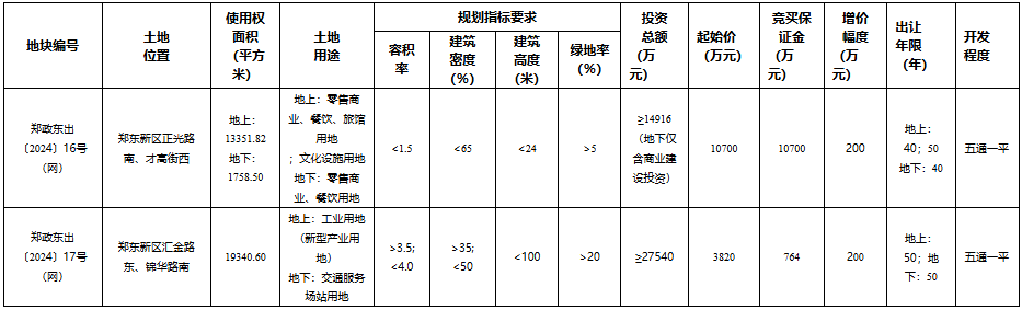 郑政东出〔2024〕17号(网)位于郑东新区汇金路东、锦华路南,使用权面积19340.60平方米,地上土地用途为工业用地(新型产业用地),地下土地用途为交通服务场站用地,起始价3820万元。