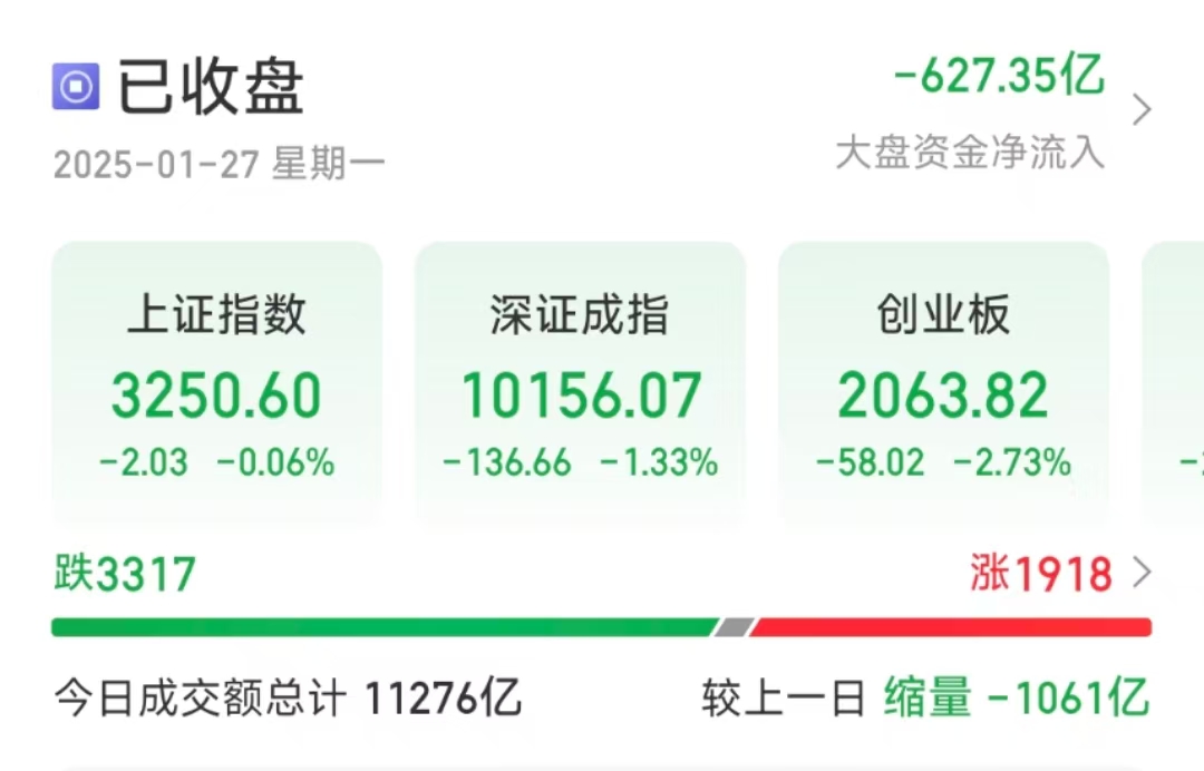 【大河财立方消息】 1月27日,龙年A股收官。截至收盘,沪指跌0.06%,深证成指跌1.33%,创业板指跌2.73%,全天交易额1.13万亿元,较上一个交易日缩量1061亿元。