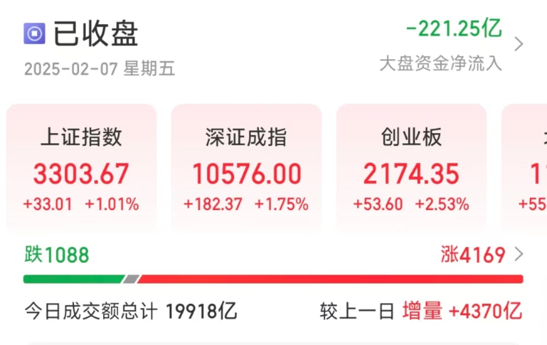 【大河财立方消息】 2月7日,A股三大指数集体收涨。截至收盘,沪指涨1.01%,重回3300点,深证成指涨1.75%,创业板指涨2.53%,全天成交额1.99万亿元,较上一个交易日放量4370亿元。