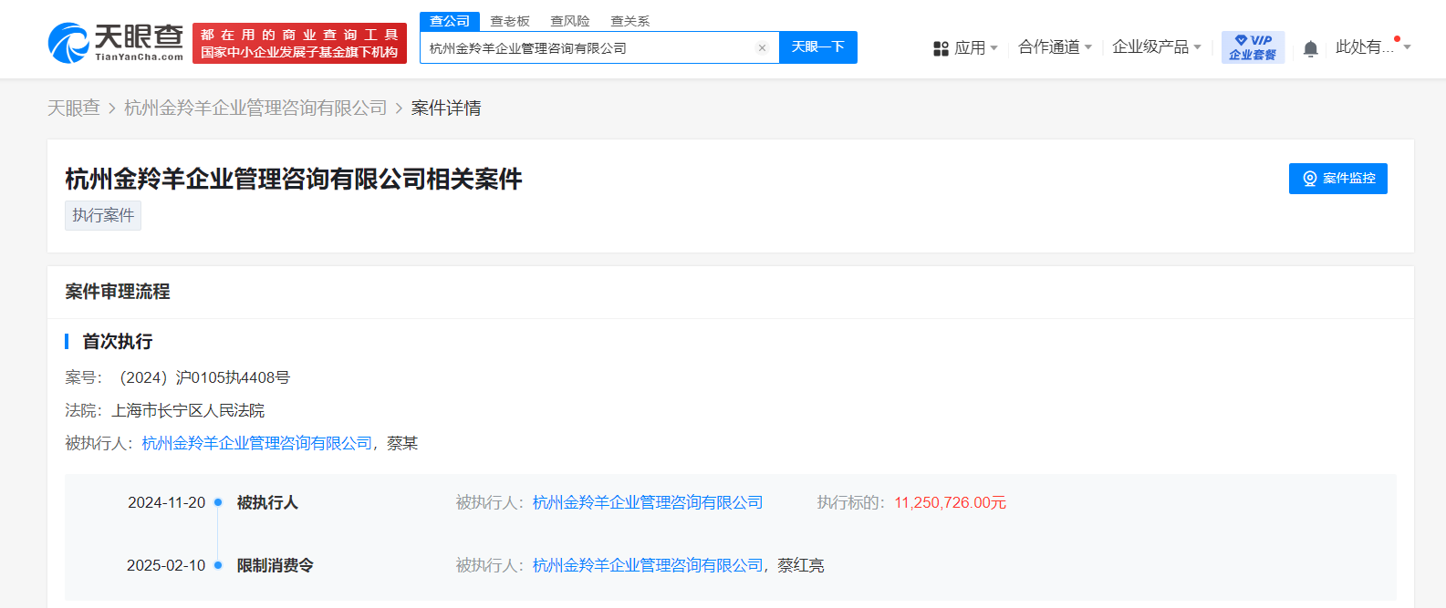 【大河财立方消息】天眼查法律诉讼信息显示,近日,因未按执行通知书指定的期间履行生效法律文书确定的给付义务,自嗨锅关联公司杭州金羚羊企业管理咨询有限公司及其法定代表人蔡红亮被限制高消费,涉及与分众传媒有限公司广告合同纠纷一案,执行法院为上海市长宁区人民法院。案件流程信息显示,去年11月,杭州金羚羊企业管理咨询有限公司已因此案被强执1125万余元。