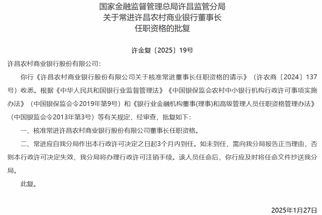 【大河财立方消息】 2月13日消息,国家金融监督管理总局许昌监管分局近日批复,核准常进许昌农村商业银行股份有限公司董事长任职资格。